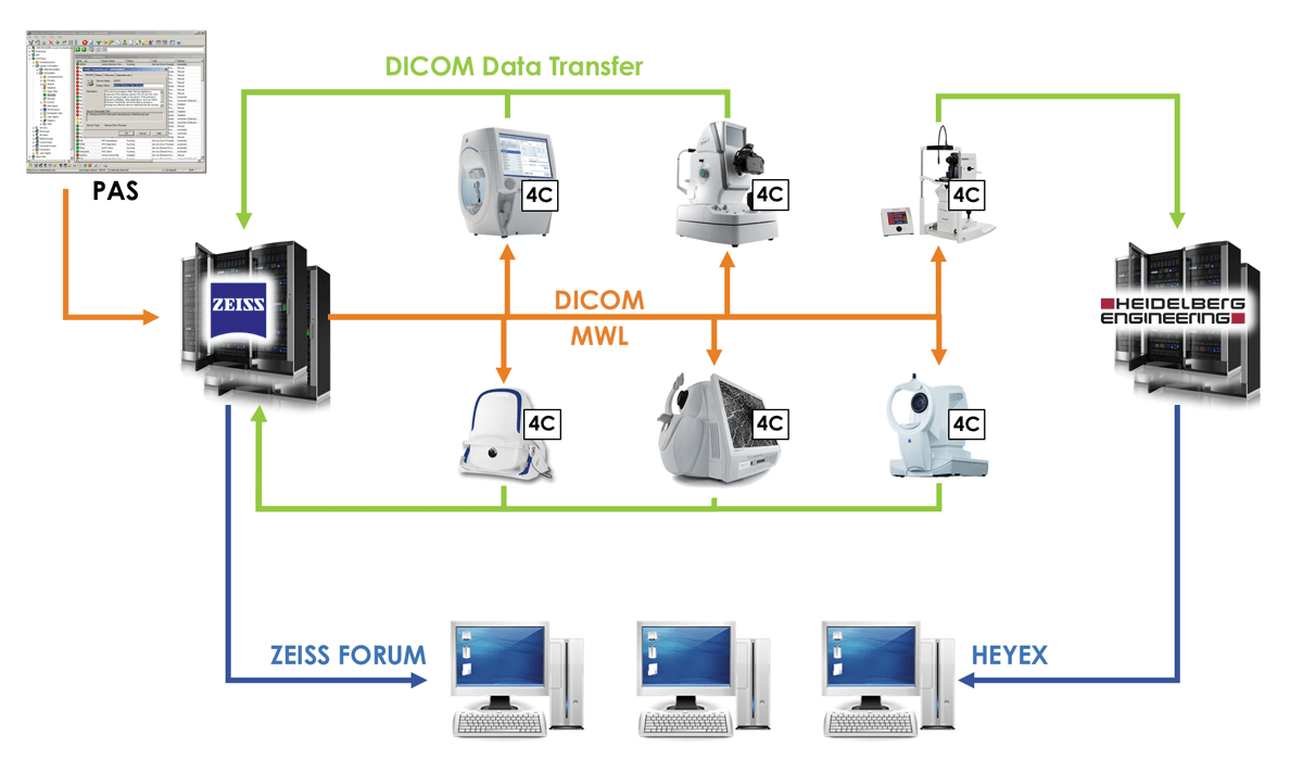 Figure 2 illustrates a network of six connected devices, each with an ODM level of 4C. Despite the presence of optical coherence tomography (OCT) devices from multiple manufacturers, all devices still achieve the maximum level possible. To maintain high quality analytic data, two ophthalmic PACS stores are required (FORUM and HEYEX). In this example, FORUM is the primary data store, and acts as the source for DICOM Modality Worklists. Even though the worklist on the Spectralis is populated from ZEISS FORUM, the data is still transferred to the Heidelberg data store (HEYEX). All six devices transfer their data to a server, and worklists replace the need for manual data entry. This earns each device a connectivity score of 4. Both the FORUM and HEYEX servers are backed up, earning the devices connected to them a safety rating of C.