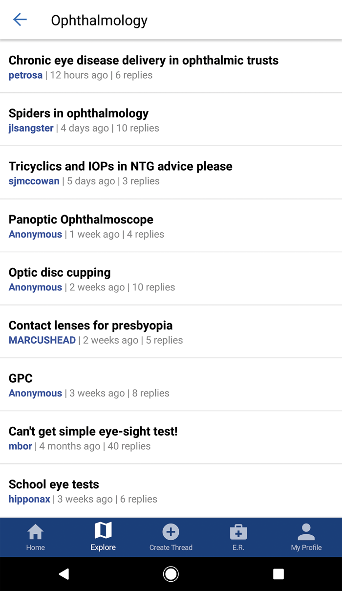 Recently the company launched an iOS and Android app to interact with its online forums. The app is free and seems well featured and reliable. As doctors.net.uk has a very large community (they claim, over 50,000 doctors) the forum is unsurprisingly very heavily used. The app even provides quick access to the ‘Emergency Room’ where users can post a question that requires a prompt response. The company quote an impressive four minutes as an average response time in this section. Clearly the app is not ophthalmic specific, though there is a dedicated ophthalmology forum, that can be easily accessed in the app. Image uploading is also supported to assist users in asking clinical questions. The community of users is closed, with individuals needing a degree of vetting with their GMC number to get an account. The forum is used for all manner of clinical and professional questions as well as plenty of general interest topics. The addition of the app will likely be of great benefit to the users and the community. Figure 1 is a screenshot of the new software.