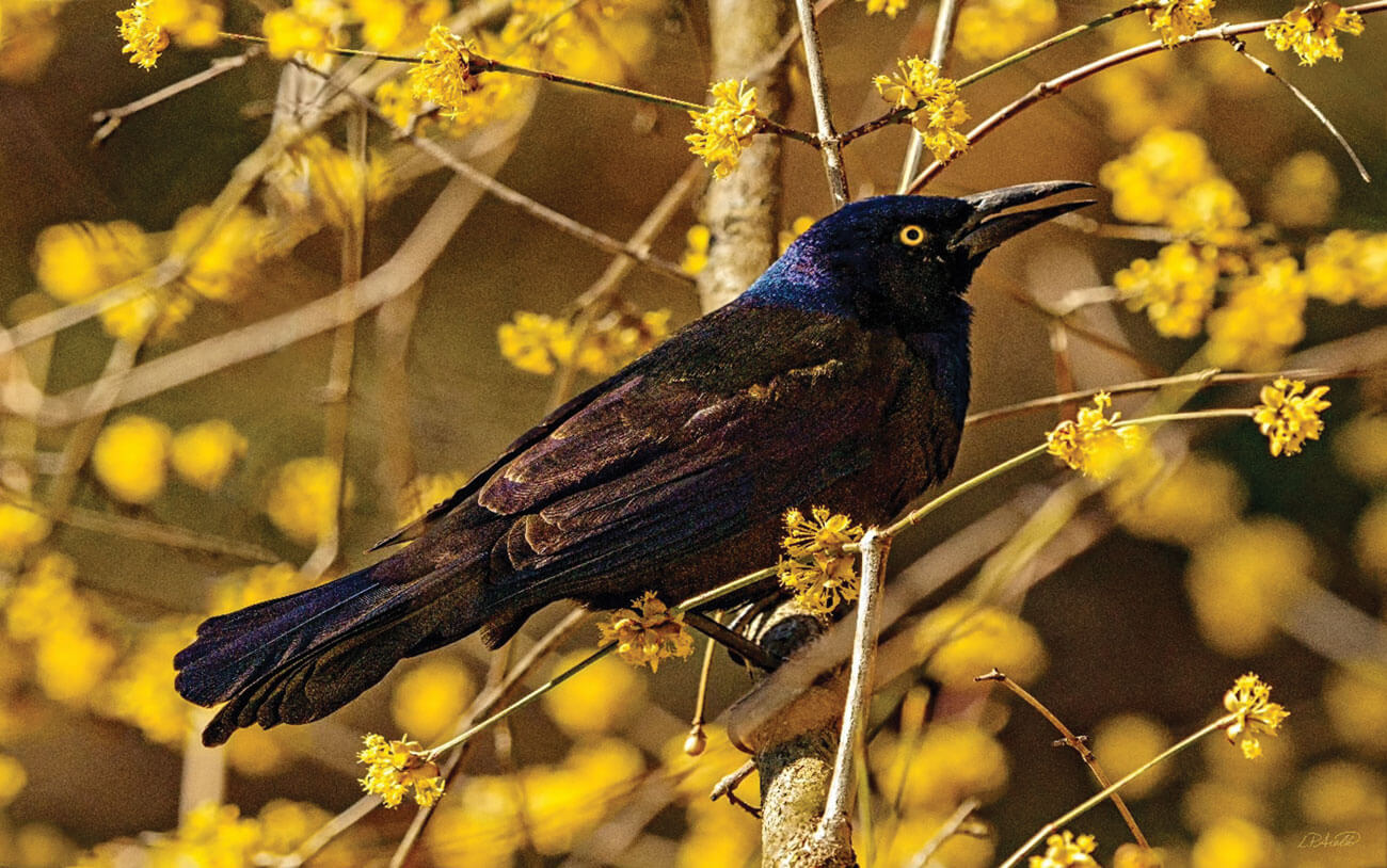 The Bronzed Common Grackle (Quiscalus quiscula) is the most common member of the blackbird group and is found throughout the eastern United States and southeastern Canada. In this image, its characteristic yellow iris matches the witch hazel (Hamamelis spp) blooms of early spring.
