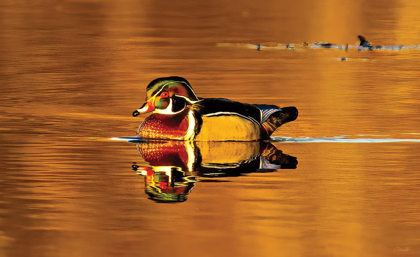 An American Wood Duck (Aix sponsa) is reflected in placid waters shortly after sunrise as it swims across a marsh at Great Meadows National Wildlife Refuge in Concord, Massachusetts.