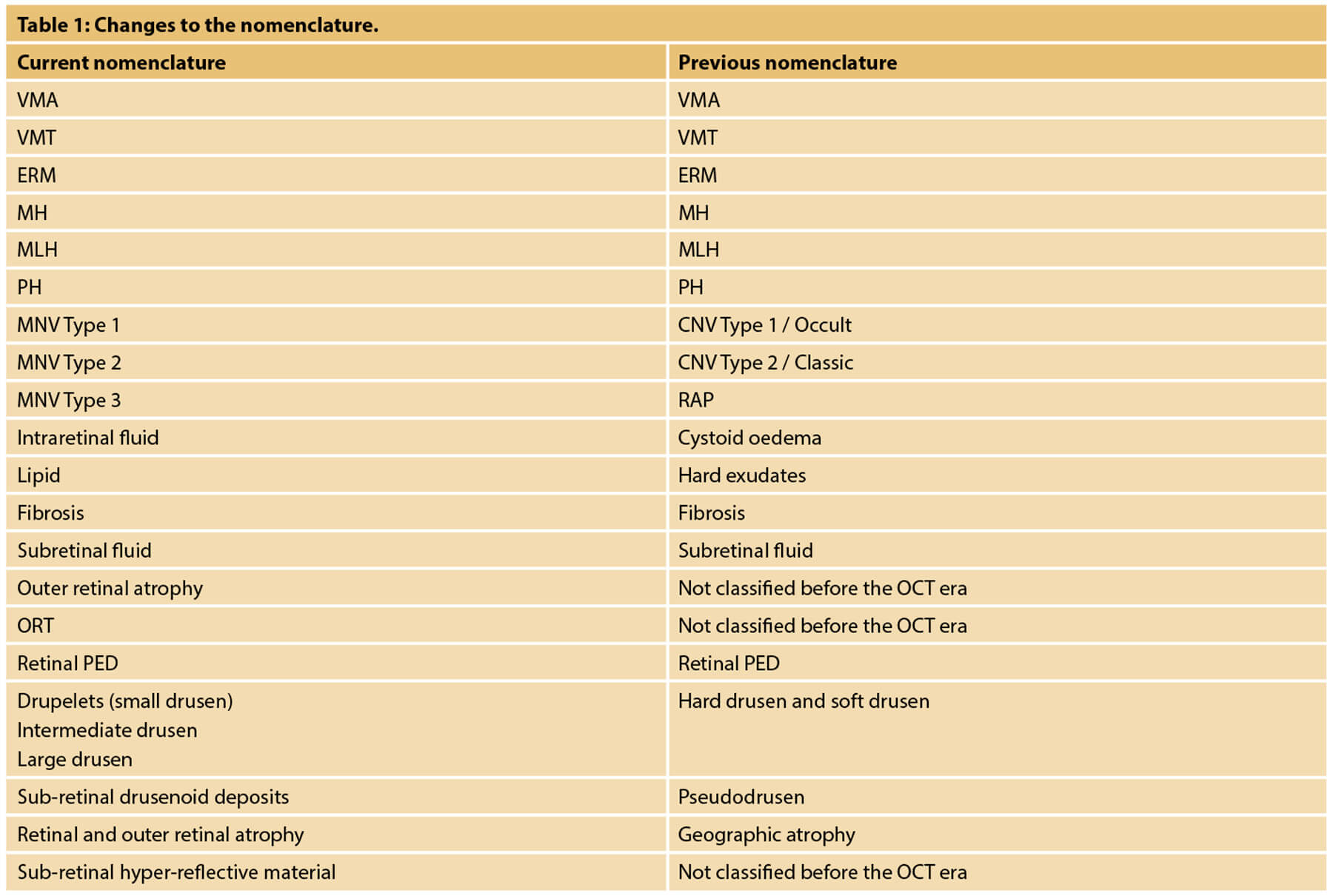 The purpose of this article is to propose a reminder of the most updated nomenclature and classification relating to the most common signs and pathologies that can be observed in daily clinical activity and increasingly with non-invasive imaging techniques such as optical coherence tomography (OCT).