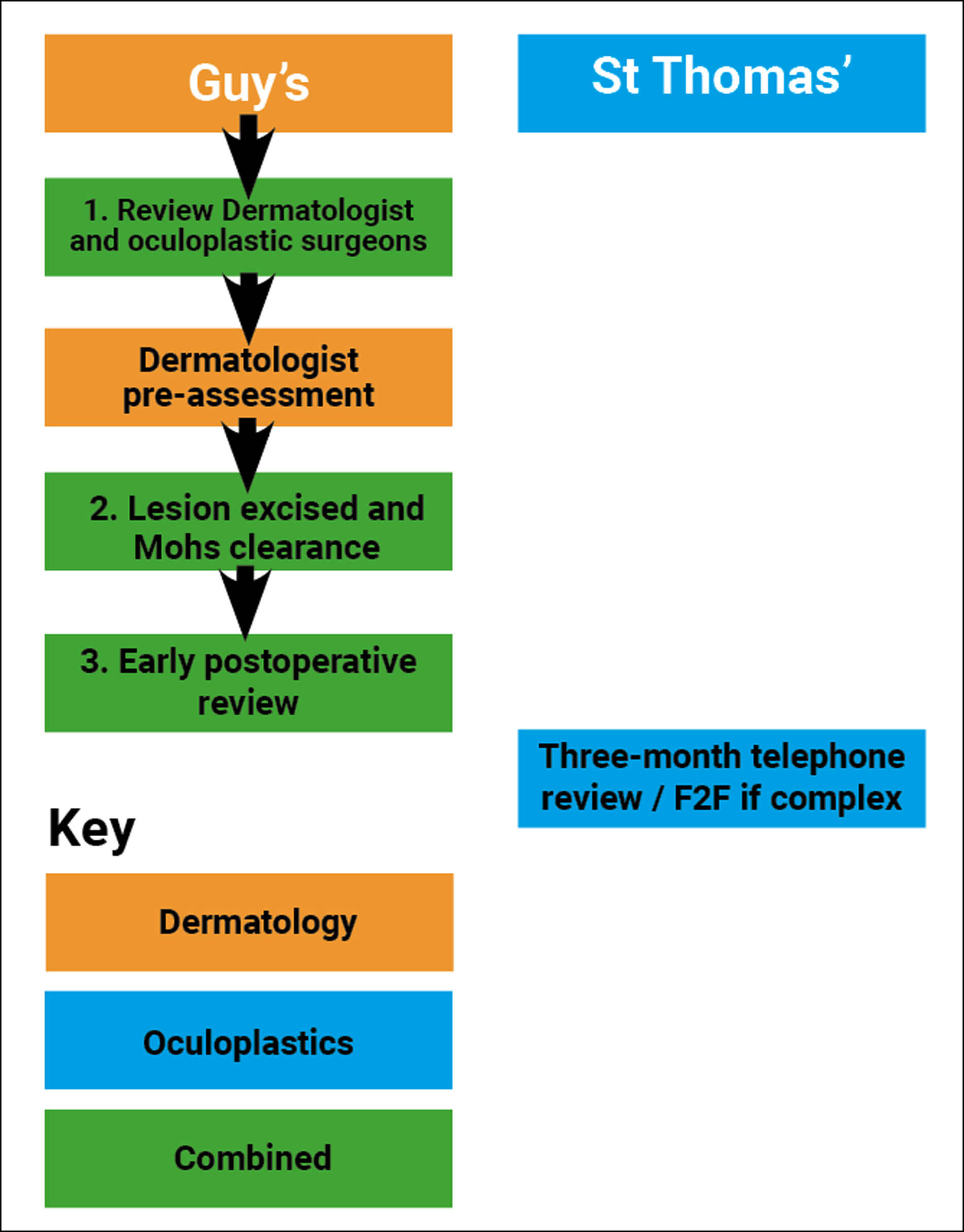 Historically, all non-melanoma periocular skin cancer cases at GSTT received the gold standard treatment of Mohs micrographic surgery (MMS) followed by oculoplastic reconstruction. As is commonly the case, MMS was undertaken in the dermatology skin cancer and laser unit (DSLU) by experienced Mohs dermatologists, and the periocular reconstruction was undertaken by the oculoplastic team at a different time point, in their own eye theatres.