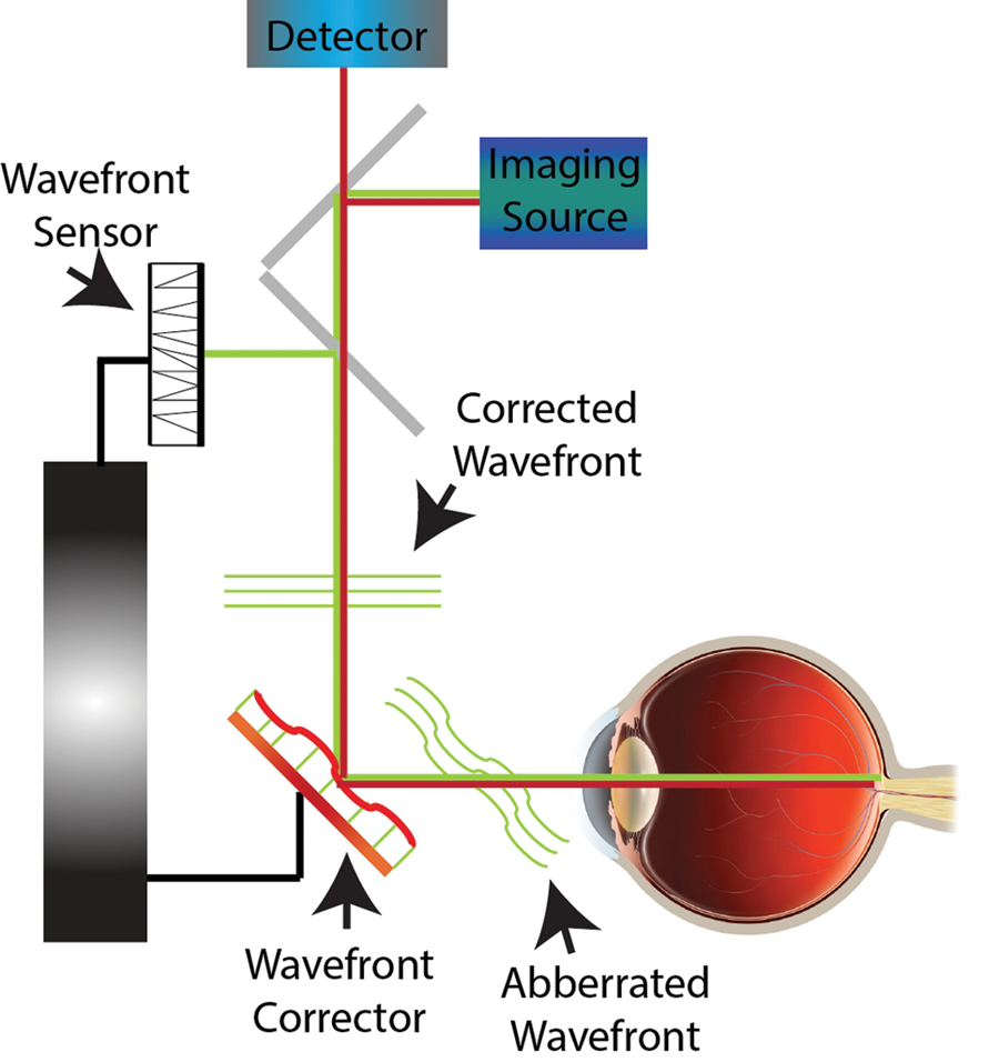 Astronomers have long dealt with similar aberrations, induced by refractive index changes going from the vacuum of space and through the earth’s atmosphere. To mitigate these aberrations, astronomers developed a system to measure the aberrations or distortions in the wavefront. They then coupled these measurements with adaptable mirrors to correct for the aberrated wavefront and to refocus the scattered light waves - resulting in a much higher resolution image. The same is true of light passing through the media of the eye, such as from the lens to the vitreous humour. The result of this wavefront distortion is a lower resolution image. In ophthalmology a wavefront sensor measures the ocular aberrations and a deformable mirror corrects for these aberrations (Figure 1).