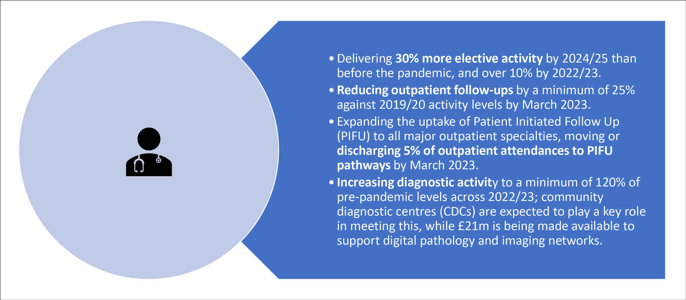 - Deliver around 30% more elective activity by 2024/25 than before the pandemic, over 10% by 2022/23.