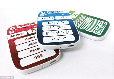 We’ve previously covered the extensive features of smartphones that can help the sight impaired. It’s clear, however, that smartphones are not for everyone. One alternative is a custom made Braille mobile phone. The UK based company Ownfone (myownfone.com) will do just that. For £60 (plus annual contract cost prices from £50) a credit card sized phone can be created with two or four pre-programmed Braille buttons. Image 1 shows buttons in raised text, Braille and patterns. The units don’t have any functions other than making calls, but could be perfect for many blind or sight impaired people. The company also markets the units with the elderly or young children in mind where photos can also be used as the buttons.