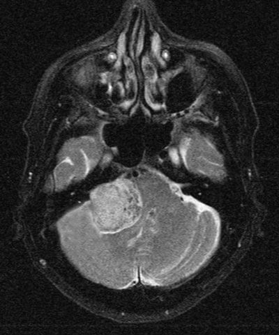 Figure 6: Brain MRI showing a large posterior fossa tumour most likely an acoustic neuroma.