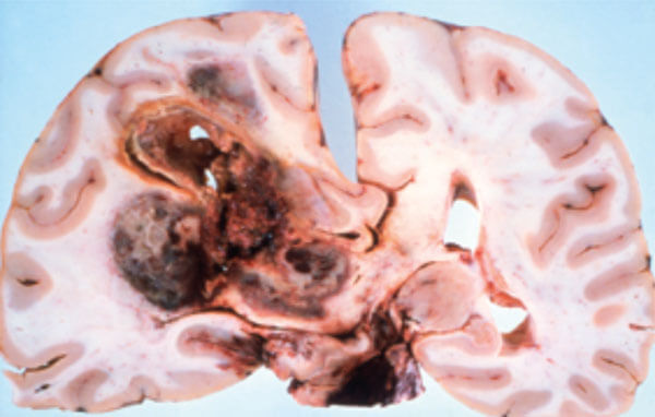 Figure 5: Pathology of an infiltrating glioblastoma with extensive haemorrhage.