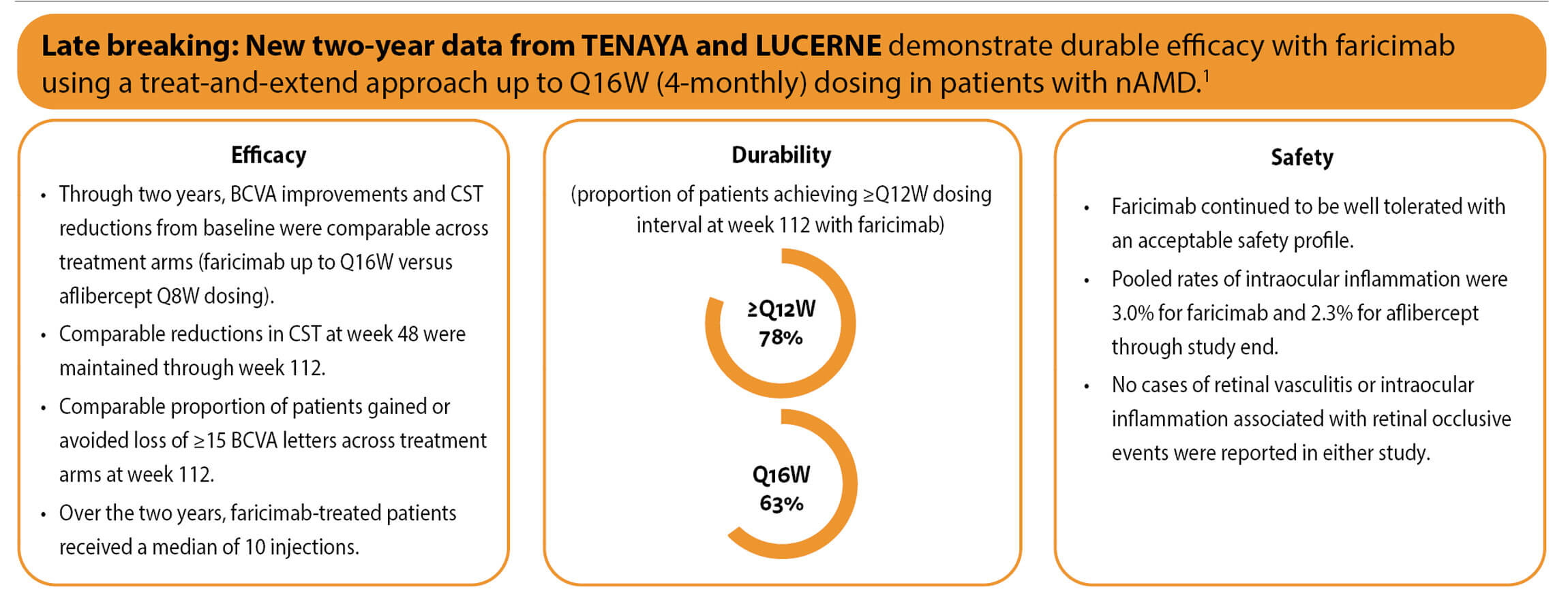 1 Khanani A. Faricimab in neovascular age-related macular degeneration: Year 2 efficacy, safety, and durability results from the phase 3 TENAYA and LUCERNE trials. Presentation at the American Society of Retina Specialists Annual Meeting, New York City, USA, 14 July 2022.