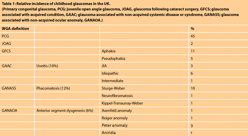 In the UK, primary congenital glaucoma (PCG) is the commonest cause of glaucoma (45%), followed by glaucoma following cataract surgery (GFCS) (16%) and Sturge-Weber related glaucoma (10%) [1].