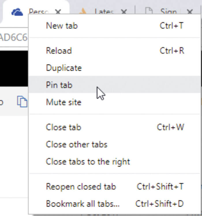 Although not an extension, pinning your favourite tabs is a useful feature to protect them from accidental closure. Simply right click on a tab and choose ‘pin tab’ (Figure 4). Pinned tabs are not automatically put to sleep by ‘The Great Suspender’ above.