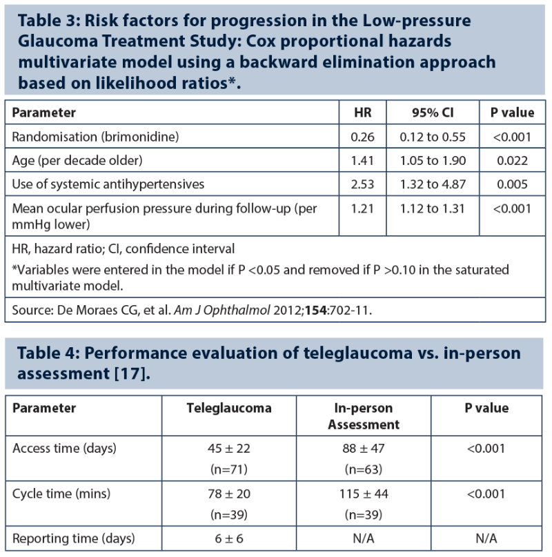 Outcomes from a collaborative care patient-centred teleglaucoma programme in Northern Alberta, evaluating 247 patient referrals from 2008 to 2012, show that most could be managed through distance collaboration [16]. A prospective comparative study showed significant improvements in mean access time and cycle time for patients seen through a teleglaucoma programme compared to those seen using a conventional in-person physician examination (Table 4) [17]. However, certain patient subgroups may not be well suited to a ‘virtual’ care model, for example individuals with advanced or advancing glaucoma damage, extremely high eye pressure (>35 mmHg), or with features suggestive of glaucoma other than primary OAG.
