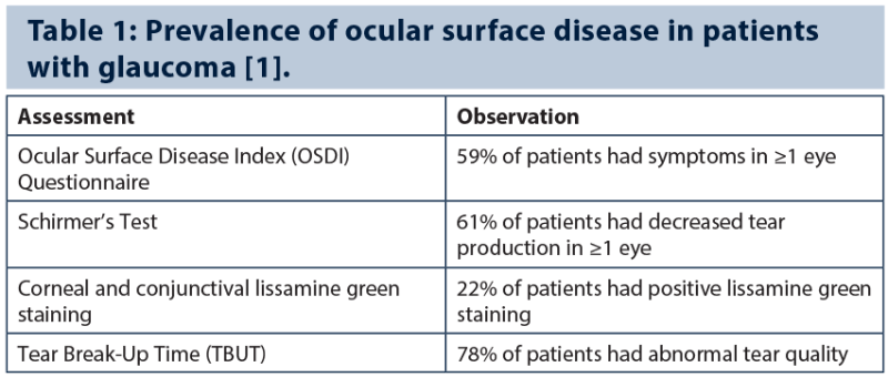 Alex J Shortt noted that the prevalence of ocular surface disease (OSD) is over-represented in glaucoma patients but is under-diagnosed and poorly treated, leading potentially to poor treatment compliance (Table 1) [1].