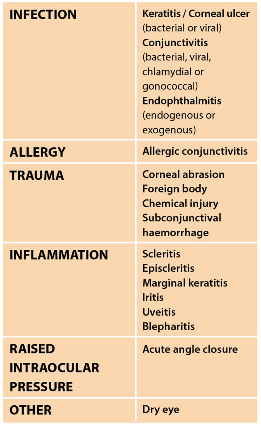 There are a myriad of causes that lead to a red eye. The following is a red eye sieve to help consider the possible differential diagnoses [4]: