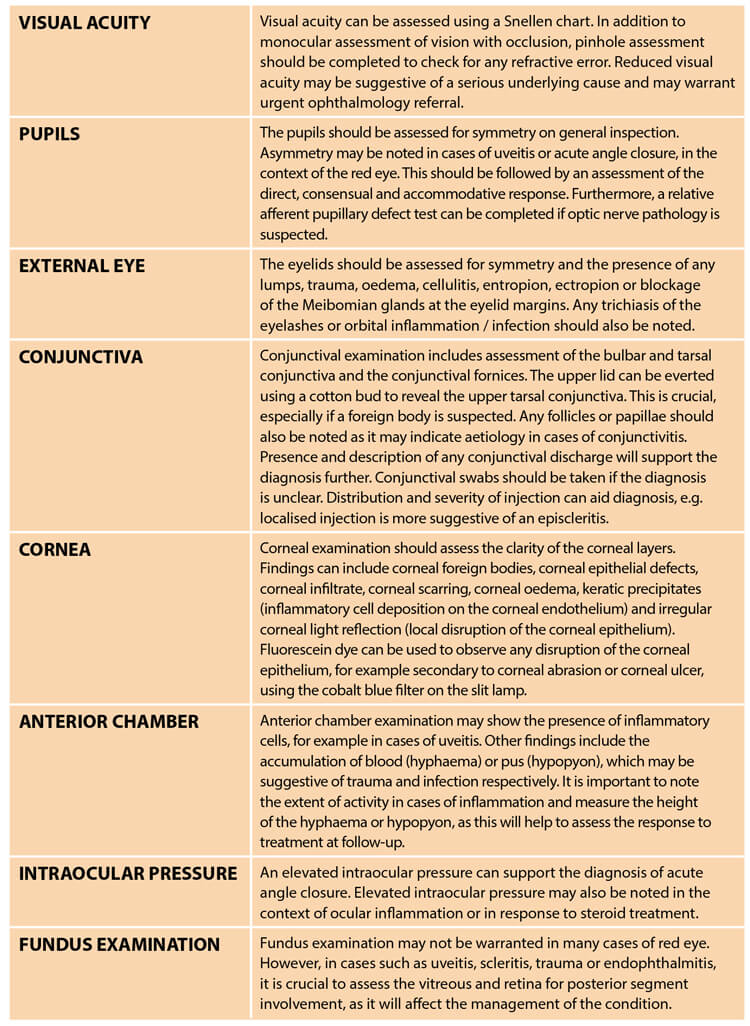 As with all presentations, good history and examination is key to an accurate diagnosis and initiation of appropriate management. A thorough history is essential as the presence of a red eye may be associated with an underlying systemic disease. Therefore, a complete history including a systems review, past medical, drug, family and social history is necessary.