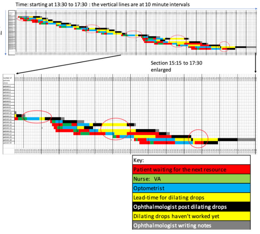 - We now have the worst of all worlds: Patients waiting in the wrong order and an ‘idle’, expensive resource, the ophthalmologist, waiting too (fourth and fifth red circles),