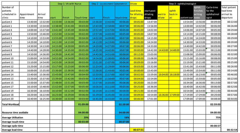 Since the PAS and the electronic clinical record were separate systems and the patients did not ‘check-out’ on PAS, the following data were collected manually. The main receptionist handed each patient a paper slip onto which they recorded their appointment time and arrival time. The clinical staff then recorded their start and finish times with each patient. The ophthalmologist recorded both the touch-time and the subsequent admin-time with each patient in order to capture his total workload. These slips were collected at the end of the clinic and entered into Excel as shown in Table 1.