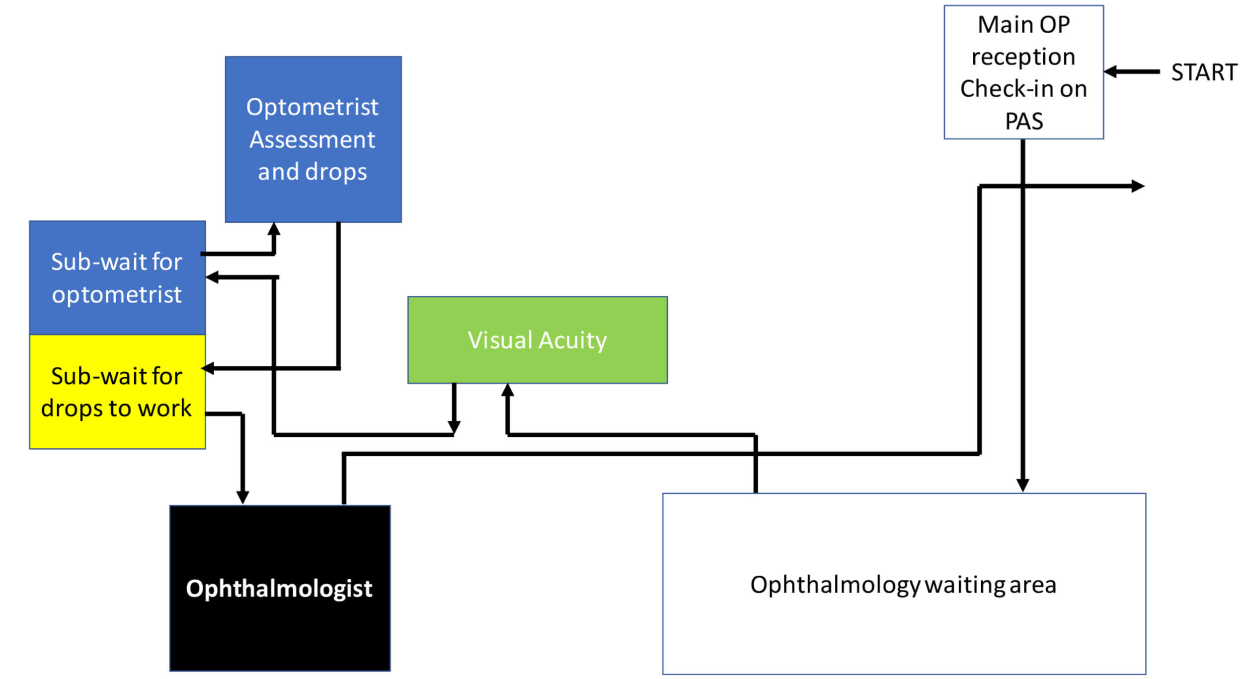 Patients arrived and were checked-in at the main out-patient reception on the hospital’s patient administration system (PAS). They waited in the main ophthalmology waiting area and were then called by the nurse for their visual acuities (VA). They waited again for assessment by an optometrist in the first of two consulting rooms who also gave the patients drops to dilate their pupil(s). They then waited outside the second consulting room for the drops to work before their consultation with the ophthalmologist.