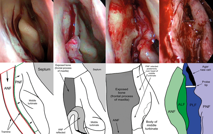 Figure 1: The right nasal cavity view during endoscopic DCR with a large osteotomy, full marsupialisation of the lacrimal sac, creation of mucosal flaps and edge-to-edge mucosal apposition for maximum primary intention healing. No mucosa is excised. A mucosal incision with a small angled crescent blade is made on the lateral nasal wall, at the roof of the nose, at least 8mm above the insertion of the middle turbinate extending down to just below the body of the middle turbinate. A parallel vertical incision made 8mm anterior to this creates the tramline. A superior incision joining the two lines completes the anterior nasal flap (A). The flap is blunt dissected off bone and reflected inferiorly (B). Following reflection of the posterior nasal flap the maxillary bone is more widely exposed (C). Following lacrimal sac marsupialisation, all four flaps are positioned with edge-to-edge apposition. The probe is seen in between the lacrimal flaps (D). Anterior nasal flap (ANF); posterior nasal flap (PNF); anterior lacrimal flap (ALF); posterior lacrimal flap (PLF).