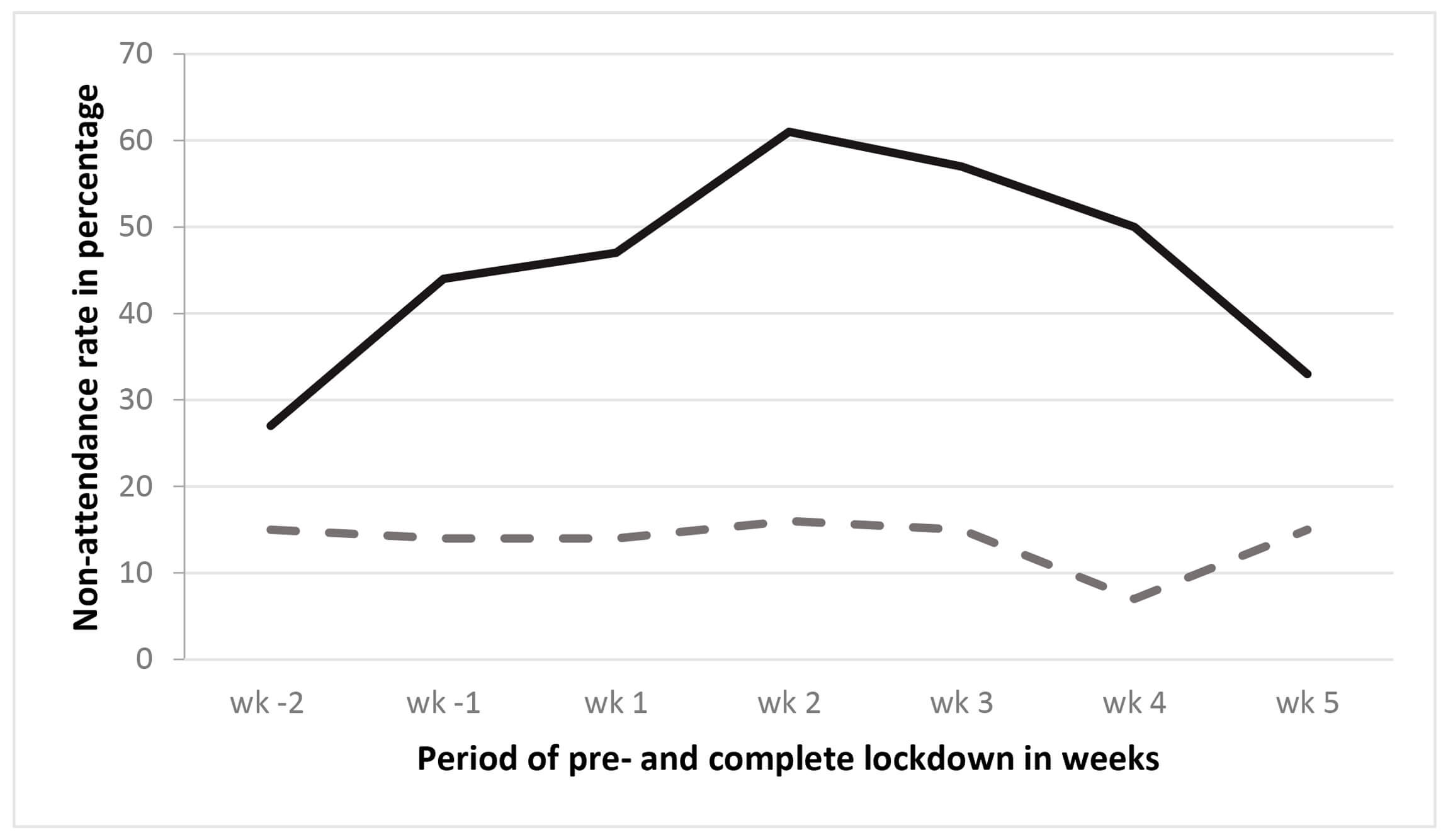 Although the government announcement of lockdown did not apply to hospital care for life-threatening or sight-threatening conditions, a large percentage of these patients DNA’d. The trend towards failure to attend had begun even before the lockdown. This was possibly because lockdown was preceded by a general advice on avoidance of non-essential travel, cancellation of all school trips and advice to avoid crowded areas, further compounded by the announcement of cancellation of elective NHS activity [2,3].
