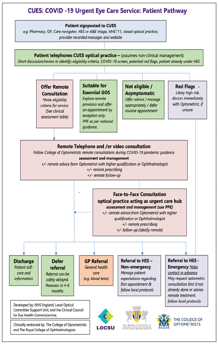 The manifestation of the COVID-19 pandemic due to SARS-CoV-2 coronavirus instigated uncertainty in optometric practice, with the initial cessation of routine sight tests and the introduction of personal protective equipment (PPE). The College of Optometrists, the Royal College of Ophthalmologists, and the National Health Service (NHS) England / Improvement worked together to establish CUES. Whilst this could be commissioned by any clinical commissioning group (CCG), many chose to contract this to Primary Eyecare Services (PES) [1].