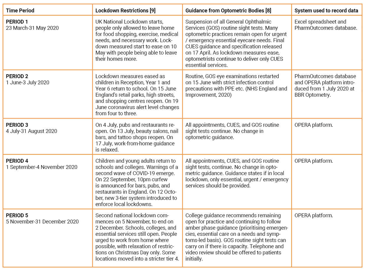 This study collated data from 23 March 2020 to 31 December 2020, deciphering how many CUES patients at BBR Optometry were managed in practice (with or without the aid of IP optometrists) or were referred to GP / HES. It also indicates any relationships between changes in UK COVID-19 guidelines and the number of referrals to GPs/HES, by comparing data in five significant periods of the pandemic. From 23 March, routine sight tests were suspended with practices urged to offer only essential services based on clinical needs and urgent eye care pathways [8]. Final CUES guidance and specification was released 17 April 2020 [1].