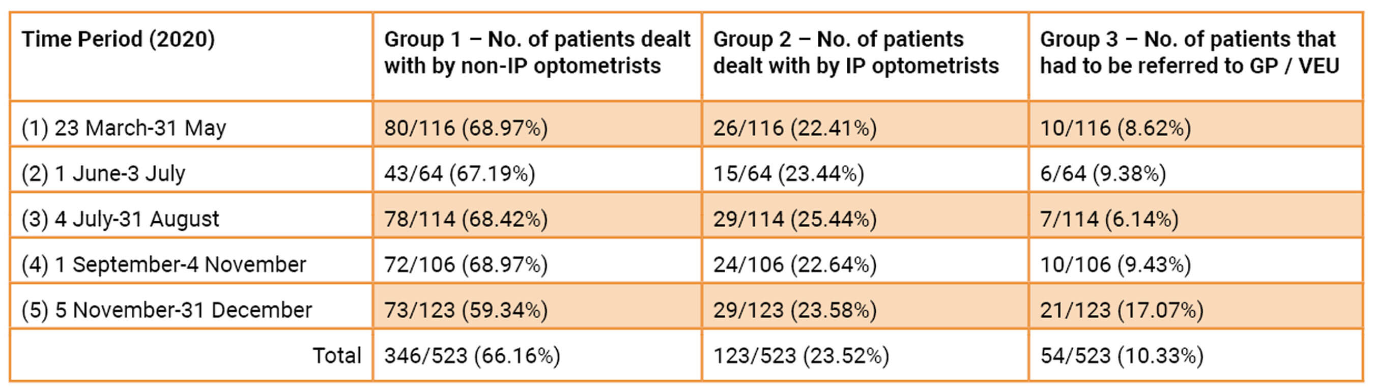 Table 4 displays how many patients in each period presented at BBR Optometry and in which group (1, 2 or 3) they were placed. Many CUES patients were managed solely in primary care, with only 54/523 (10.33%) patients referred to GP/VEU between 23 March and 31 December 2020. In addition, 346/523 (66.16%) could be managed by non-IP optometrists, and 123/523 (23.52%) were managed by IP-optometrists. Meaning, 469/523 (89.67%) of all CUES patients were managed in practice. One patient in this study was unsuccessfully treated by IP-optometrists, so required an onward referral, and was therefore placed into group 3.
