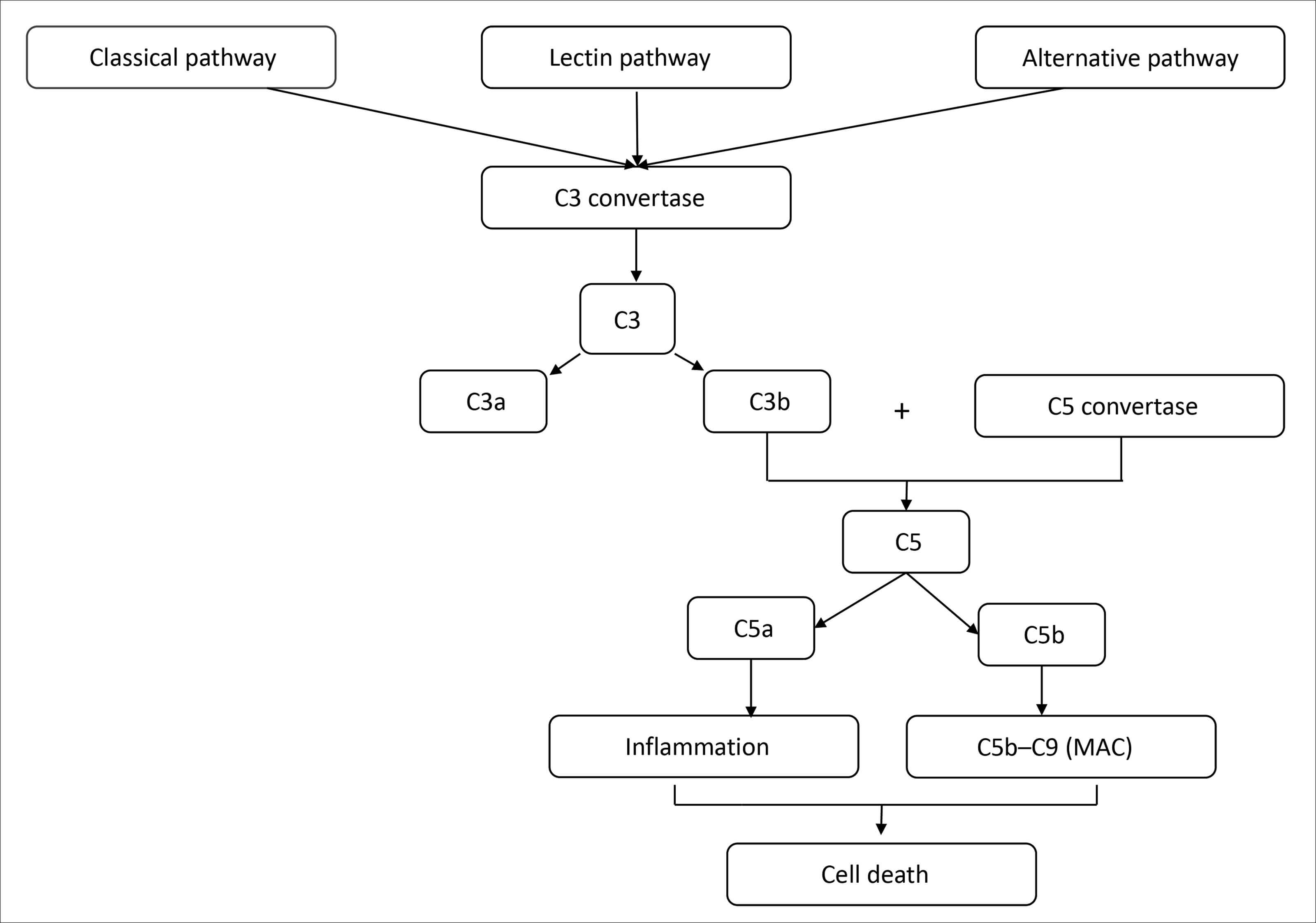 Figure 1: The complement cascade: All three pathways converge at C3 convertase, leading to the cleavage of C3 into C3a and C3b, formation of C5 convertase, cleavage of C5 into C5a and C5b, and eventual formation of the membrane attack complex (MAC) and subsequent cell destruction (Patel 2022). Adapted from: Desai D, et al. Eye 2022;36:294-302; Patel PN, et al. Biomedicines 2022;10:1884.
