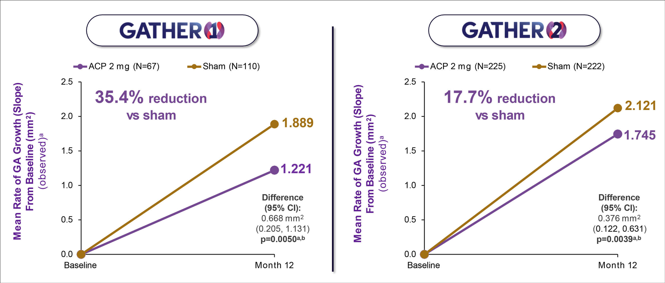 In GATHER1, for the primary endpoint assessment (square root transformation) at 12 months, there was a 27.4% (p=0.0072) reduction in the mean rate of growth (slope analysis) estimated based on GA area between the ACP 2mg group and the corresponding sham control group over 12 months. Using observed data, there was a 35% (p=0.0050) reduction in the mean rate of growth (slope analysis) estimated based on GA area between the two groups over 12 months. Treatment with ACP 2mg was associated with continued reductions in the progression of GA growth compared with sham through 18 months [12].