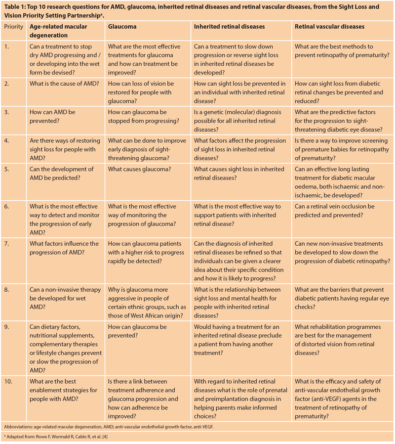 4. Rowe F, Wormald R, Cable R, et al. The Sight Loss and Vision Priority Setting Partnership (SLV-PSP): overview and results of the research prioritisation survey process. BMJ Open 2014;4:e004905.