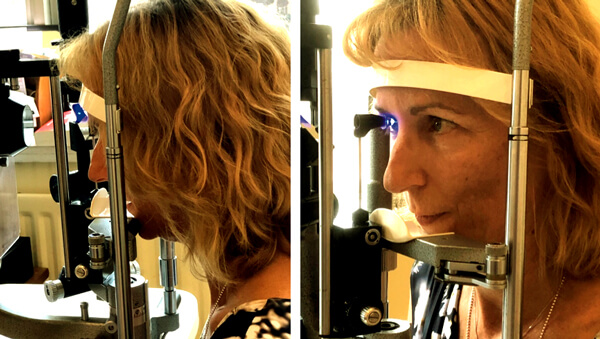 Measure the patient’s IOP in primary gaze using the Goldmann applanation tonometer in the standard fashion.