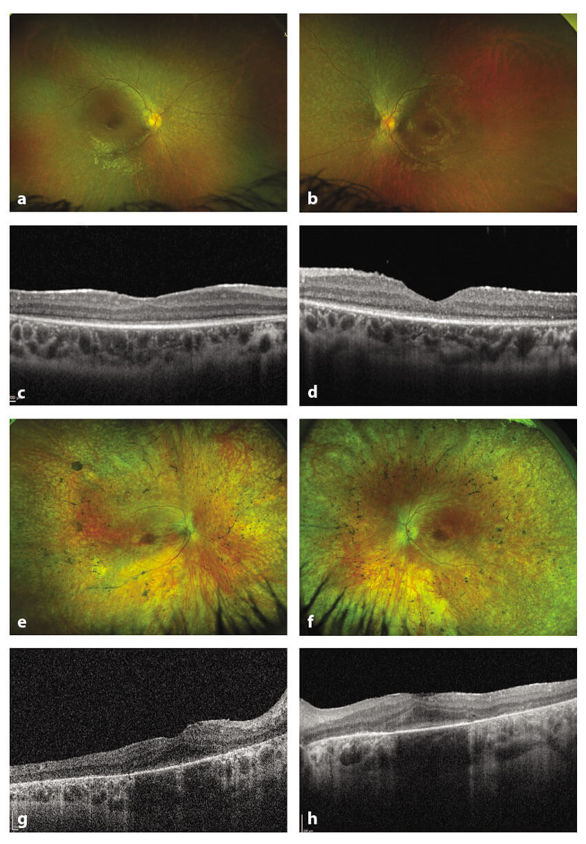 e-h: 30-year-old female with retinal pigmentary changes and disruption of outer retinal layers on OCT.
