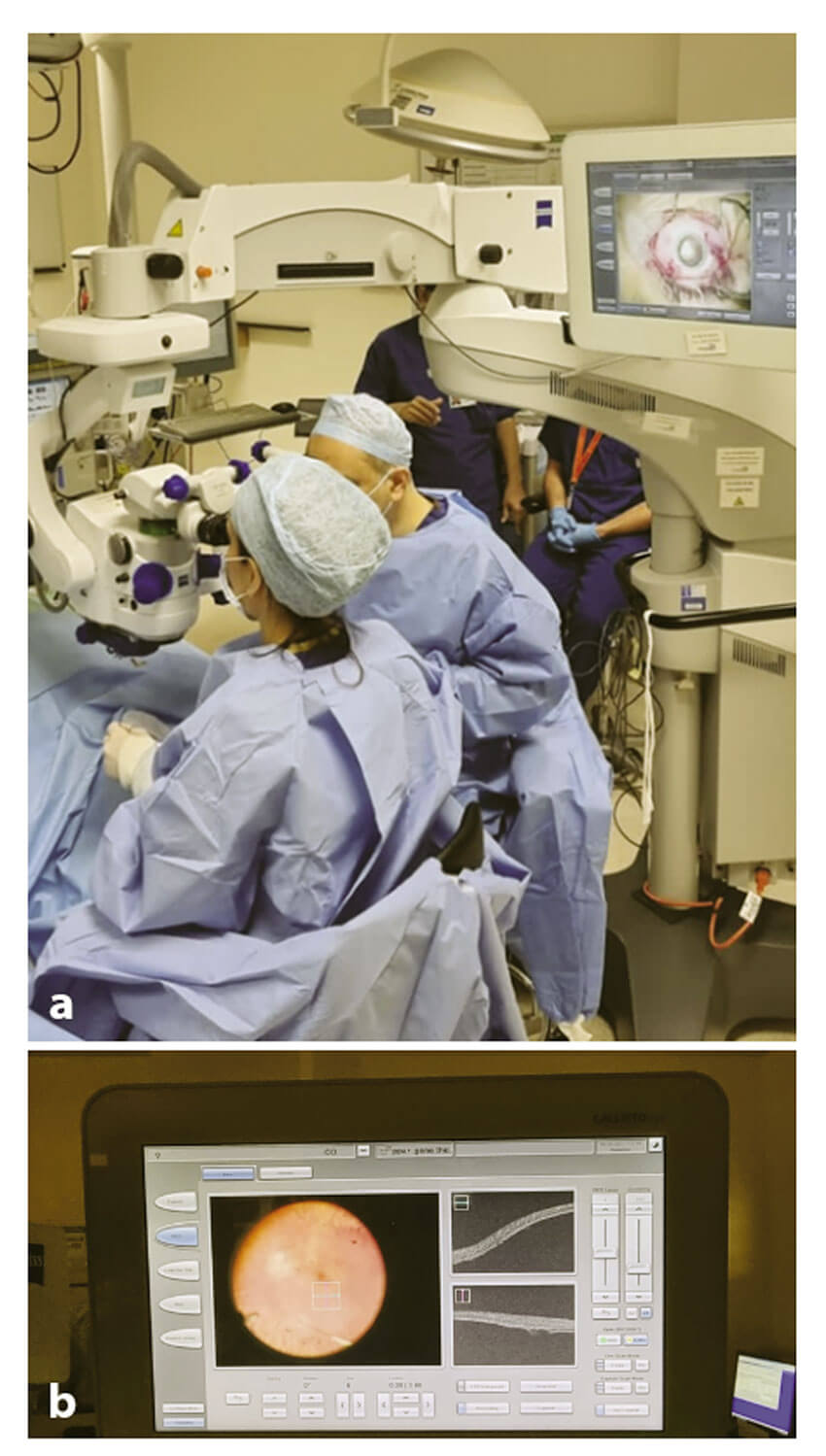 On the day of the surgical procedure, the drug has to be thawed and prepared in aseptic conditions. This can take approximately 60 minutes, and so this has to be taken into account in scheduling the operating list. A pars plana vitrectomy (PPV) is carried out, followed by the subretinal injection of 0.3ml of Voretigene neparvovec at the posterior pole. An intraoperative optical coherence tomography (OCT) is useful in ascertaining the delivery of the drug at the subretinal location (Figure 2). Fluid / air exchange is then performed and the eye is left air-filled at the end of the procedure. Patients are instructed to posture supine for 24 hours, in order to minimise the risk of macular folds due to the large volume of subretinal injection and to avoid displacing the gene outside the inferior arcade. Patients are usually kept in overnight to facilitate the posturing regimen.