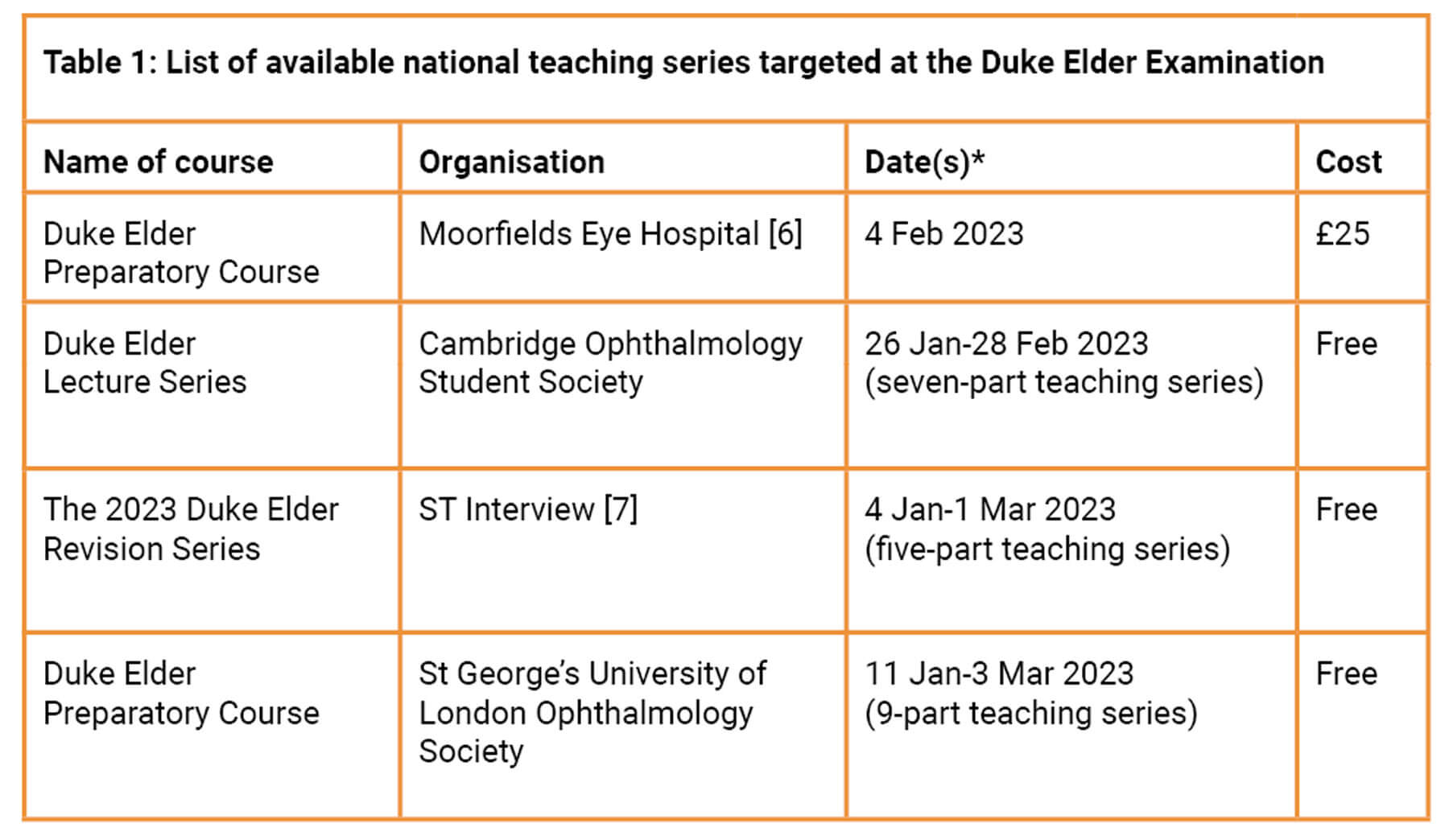 *The dates provided are derived from the schedules of the most recent courses conducted for the Duke Elder Examination in 2023 and may be subjected to changes by the respective organisers in subsequent years.