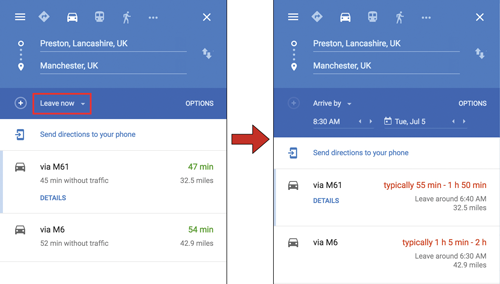 For an example I have chosen Preston to Manchester by car. You can see from Figure 1 that the estimated time ‘leaving now’ (9.30pm on a Monday) is 48 minutes. Also see the highlighted ‘Leave now’ button. Pressing that will let you also choose ‘Depart at’ or ‘Arrive by’. Let’s choose ‘Arrive by’ 8.30am and also choose Tuesday. The estimated travel time now is up to 1h 50m, with Google Maps suggesting I should leave around 6:40am. These estimated times are very accurate and based on the past history of others travelling the route with their phones.