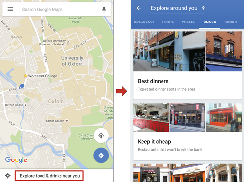 This is a well-advertised feature within the app, but few people I know have ever tried it. The feature is very good at suggesting local places for breakfast, lunch, coffee, dinner or drinks. To use it just open the Google Maps app at your current location and press the ‘Explore food and drink near you’ banner at the bottom (see Figure 3). You can then scroll left and right, depending if you want breakfast or dinner, etc. or up and down to move between types of establishment.