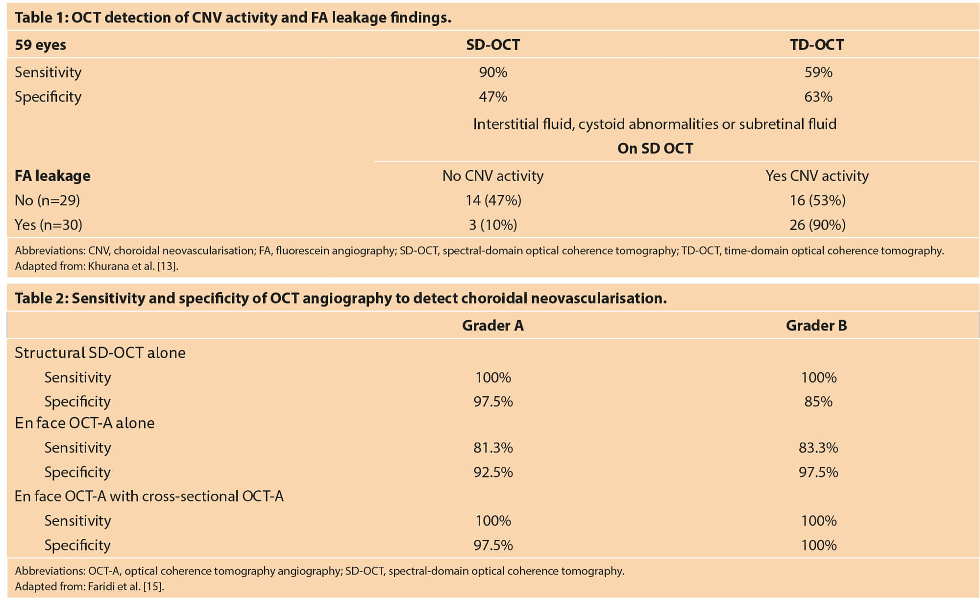 Castillo et al. observed although OCT is highly sensitive, it has poor specificity, and recommended that OCT should not be used alone to detect CNV activity in patients being monitored [12]. Khurana evaluated agreement of OCT findings with presence or absence of fluorescein leakage from CNV [13]. Spectral-domain OCT was more likely than time-domain OCT to detect abnormalities when leakage from CNV was detected after anti-VEGF therapy. Referring to false-negatives on OCT, Dr Bressler said that she did not want to miss 10% that are active on the gold standard FA test (Table 1) [13].