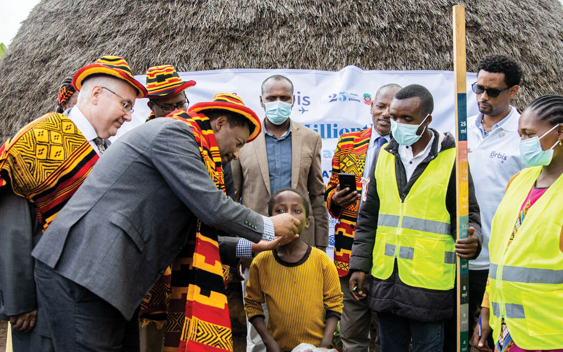 Lelisa Ammanuel, Senior Disease Prevention and Control Advisor, Ethiopia Ministry of Health, administers the 100-millionth Zithromax dose delivered by Orbis in Ethiopia to Hizkiel, six-years-old on May 9, 2023. Also in attendance was Derek Hodkey, Orbis International President and CEO. ©Genaye Eshetu/Orbis.