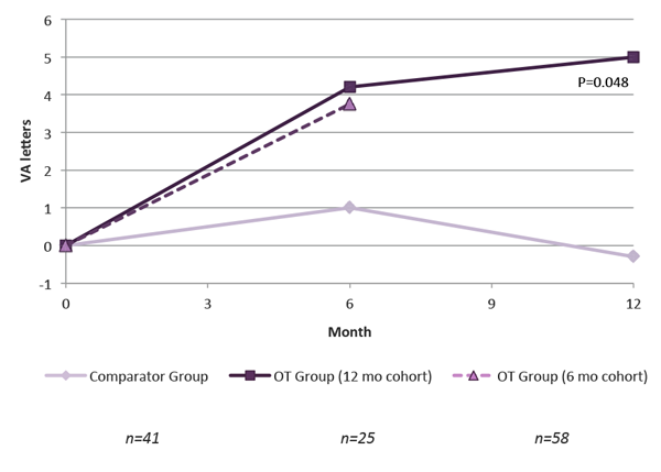 In another Oraya-treated cohort involving the first 58 wet AMD patients with six months’ follow-up since receiving their first ranibizumab injection, mean BCVA change from baseline to month six was just under four letters. In this series, 57% achieved VA 6/12 or better at six months compared with 41% at baseline. More than half (57%) required only the loading phase of three consecutive monthly ranibizumab injections.