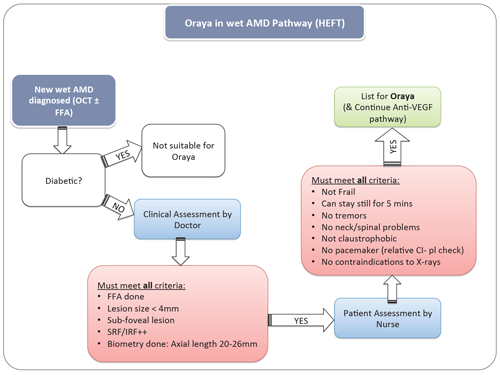 Royal Hallamshire Hospital (RHH) in Sheffield was the first NHS centre in the UK to offer Oraya Therapy to suitable newly-diagnosed wet AMD patients, commencing in May 2014. Eligible patients must have an active lesion, with a GLD less than 4mm on fluorescein angiography centred on the fovea, minimal fibrosis, abnormal macular thickness and an axial length between 20-26mm. Stereotactic radiotherapy is given within two weeks of the first anti-VEGF injection.