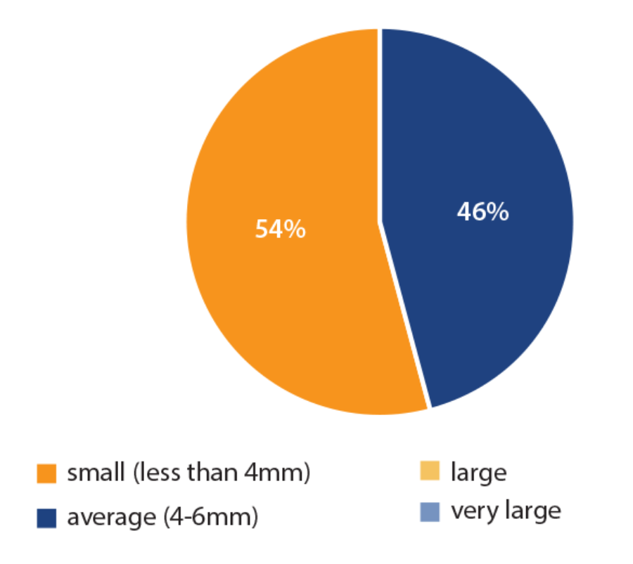 The study population included a total of n=50 patients, 86% female and 14% male with an average age of 59 years. Of the sample group, 10% were diagnosed with dry eye and so had a drop of Sodium Chloride instilled into the lower fornix prior to the insertion of Mydriasert. Ninety percent of inserts were removed by the surgeon pre-administration of local or general anaesthetic; 6% were removed by appropriately trained nursing staff on the ward due to time constraints (Mydriasert had been in situ for nearly the two-hour deadline) and 4% fell out of the patient’s eye preoperatively. On average, the Mydriasert insert was in situ for approximately 73 minutes before removal, well within the deadline for removal. To create a baseline, the average size of pupil was measured before insertion of Mydriasert (Figure 1).
