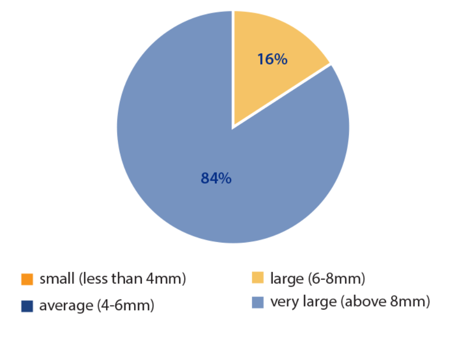 In comparison, following the insertion of Mydriasert and at a minimum of 45 minutes following the insertion (pupil check point), it was noted that 84% of patients had very large pupils (Figure 2).