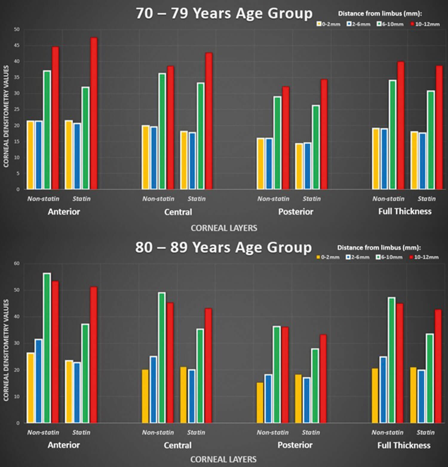 This trend of reduced densitometry levels for statin users versus non-users in the 80-89 years age group persisted, with the exception of three results out of 32 obtained for all respective corneal regions. Specifically, the data from all 2-6mm and 6-10mm concentric corneal zones across all levels of depth were found to be statistically significant besides the posterior cornea 2-6mm zone (Figure 4).