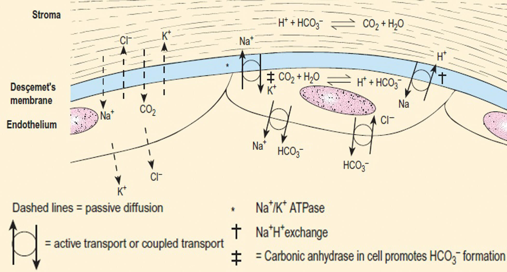 Figure 1: The corneal endothelial pump with ion transport mechanisms outlined (legend provided) [1].