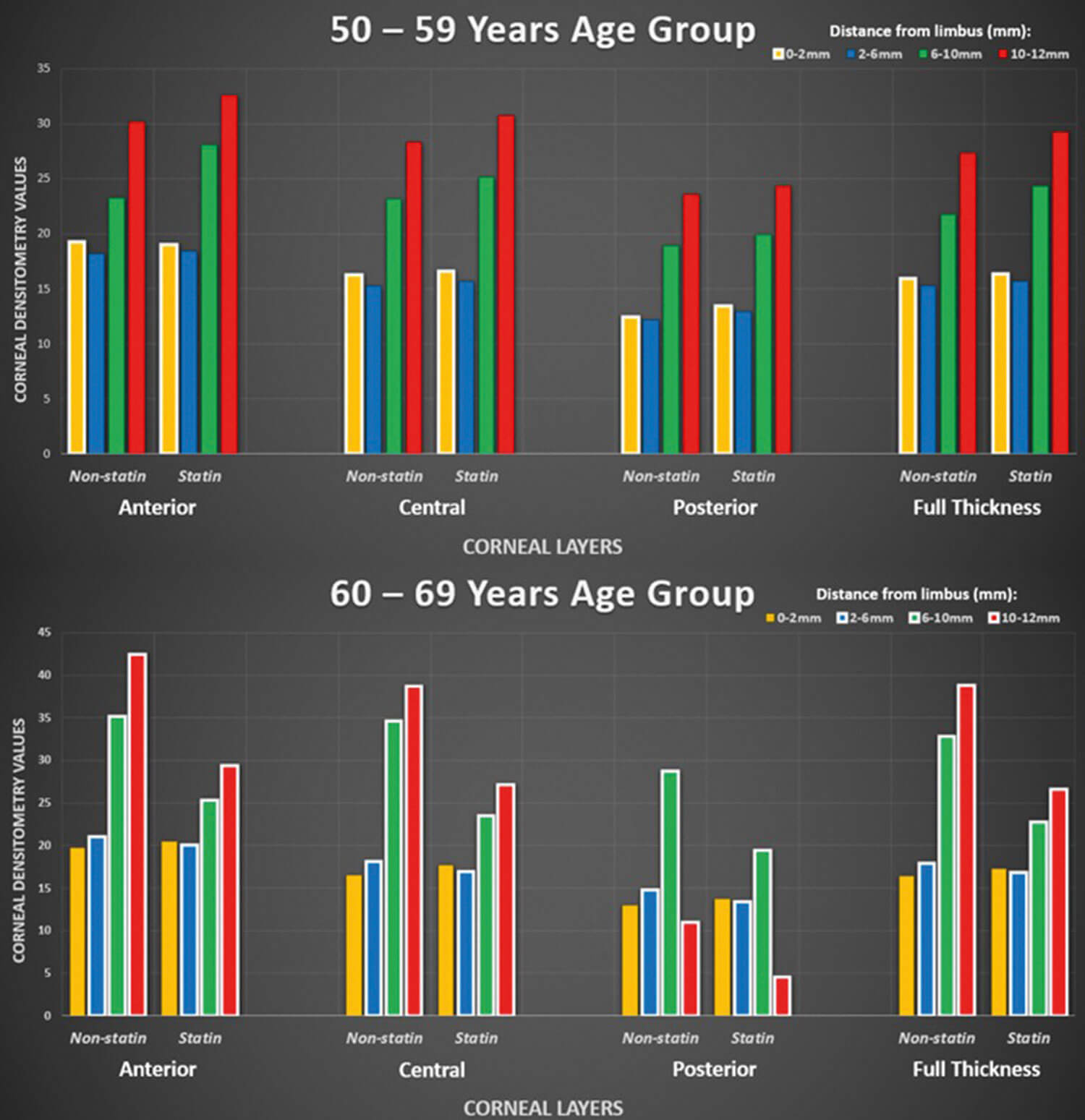 A highly different trend was seen in the 60-69 years age group than the previous age group. Besides four results out of 32, all other values depicted lower densitometry levels for those in that age group that took statins. Furthermore, for the 6-10mm and 10-12mm concentric corneal zones, there was a statistically significant difference in densitometry between those taking statins and non-users across all levels of corneal depth, with the latter concentric zone showing higher levels of opacity (Figure 3). For the 6-10mm group, statin users expressed densitometry values of 22.78 compared to 32.86 for non-statin users. Similarly, for the 10-12mm group, statin users had values of 26.64 and 38.79 comparing statin users to non-users.