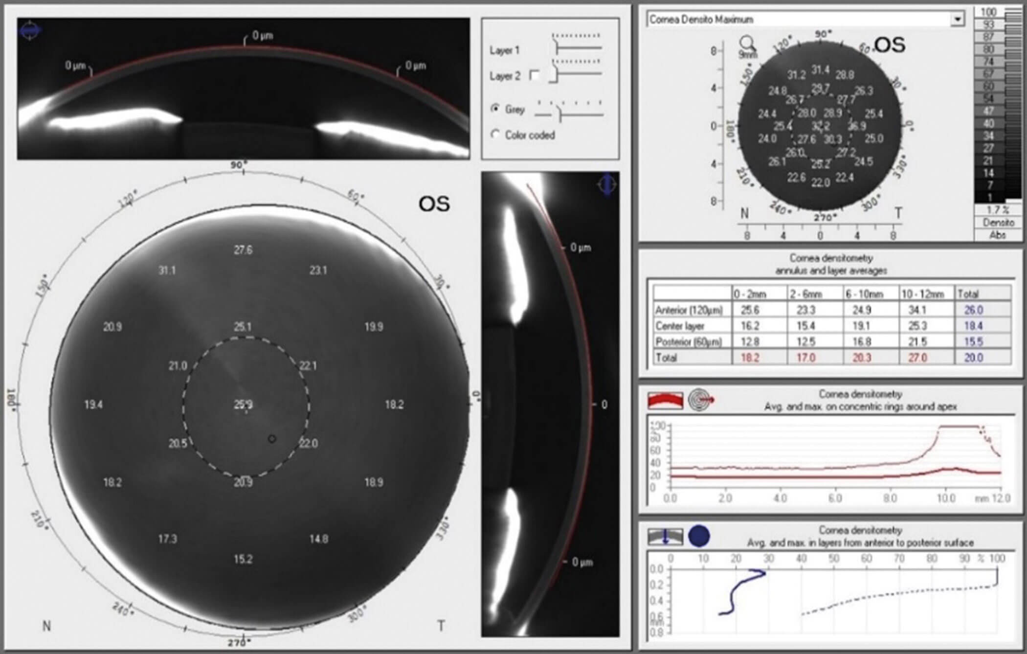 Figure 2: OCULUS Pentacam® topographical densitometry display [9].