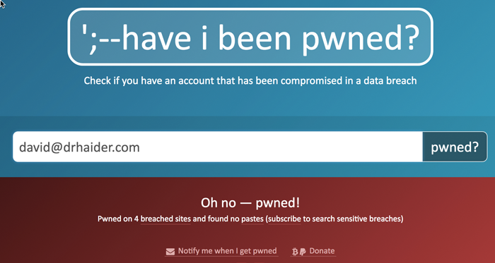 This site will check if any of the websites you have used have been hacked (or breached). If your details have been involved in a breach, your email and password (among other data) will likely have been published online.