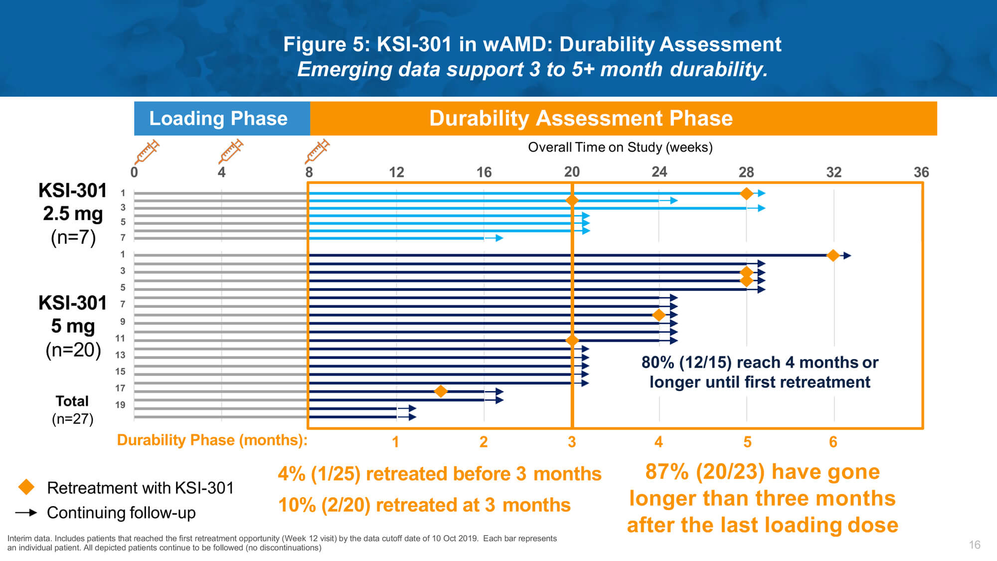 Remarkable biological durability was observed, with a majority of treated eyes extended to four months or beyond without requiring retreatment after three loading doses. A phase 2 study (DAZZLE) will evaluate KSI-301 5mg dosed every 12 to 20 weeks compared to aflibercept 2mg every eight weeks after three initial monthly loading doses in treatment-naïve nAMD patients.