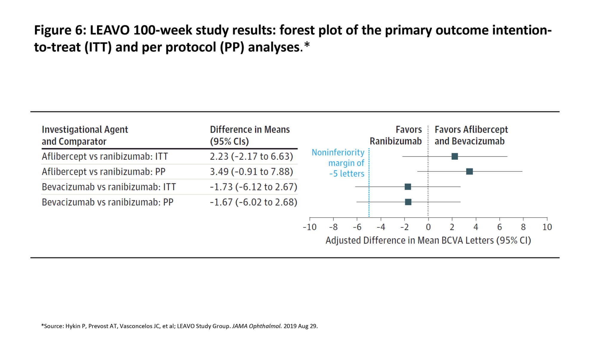 18. Hykin P, Prevost AT, Vasconcelos JC, et al; LEAVO Study Group. Clinical effectiveness of intravitreal therapy with ranibizumab vs aflibercept vs bevacizumab for macular edema secondary to central retinal vein occlusion: a randomized clinical trial. JAMA Ophthalmol 2019 [Epub ahead of print].