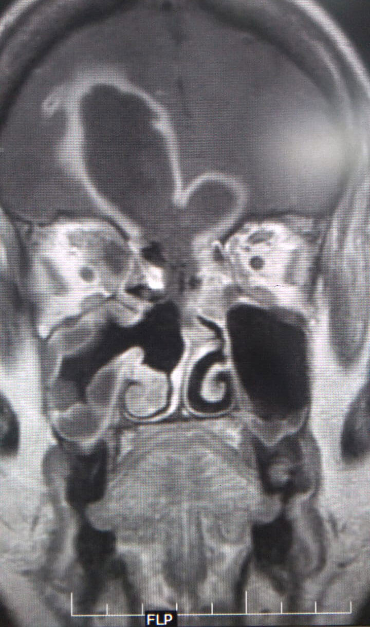 MRI scans of a patient with ROCM showing a large frontal lobe brain abscess