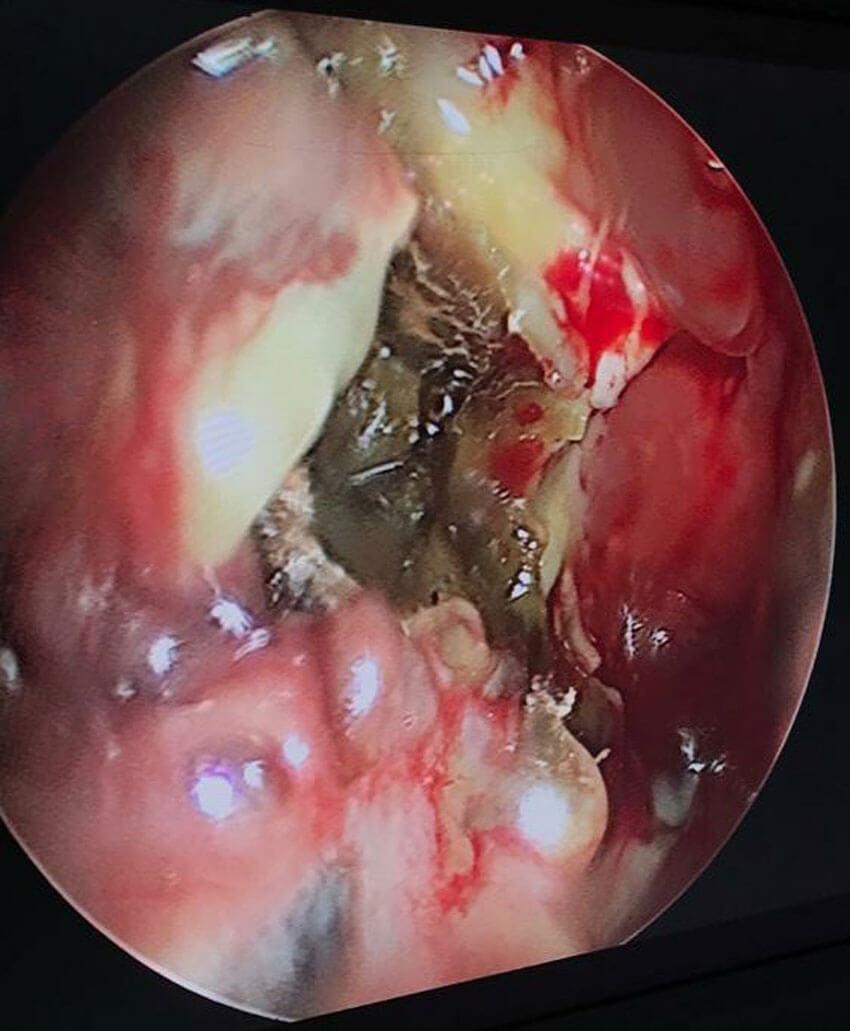 Endoscopic picture of mucor with necrotic tissue in middle meatus.